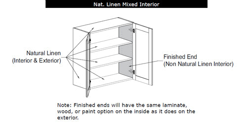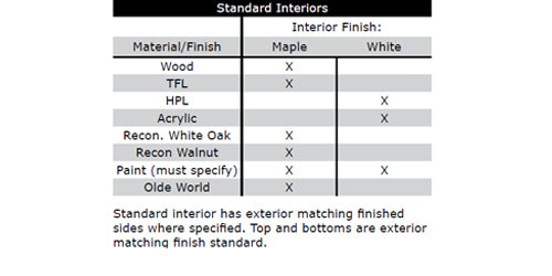 When using the standard construction, finished ends do not change the interior color. Bottoms will match the exterior of the cabinet. This chart shows what interior you will get standard with the finish you use.