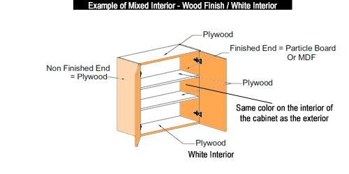 If you choose plywood construction in a wood finish with white interior. Finished ends will have the same color on the interior of the cabinet as the exterior of that finished end. In other words, you will have a multicolored interior.