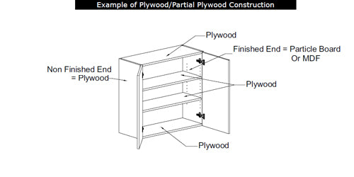 When using this option with Plywood construction, the end that is finished will have an interior (white, maple, or same finish as exterior) based on the options above. The end panel on the finished end side will be 1 ½ in lower than the cabinet bottom and will be the same as the interior (white, maple, or same finish as exterior).